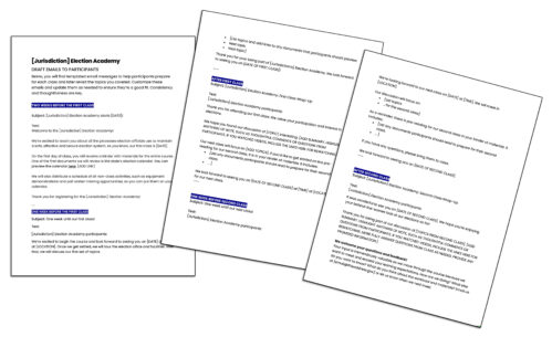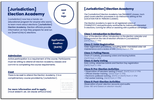 The Creating an Election Academy Manual will guide you through four phases: developing, scheduling, running and concluding an election education course in your jurisdiction. The manual includes links to all templates and example materials, which you can customize for your town, city or state. Or access all materials at one time by downloading the zip file at the top of this page. See below to preview and download individual templates.